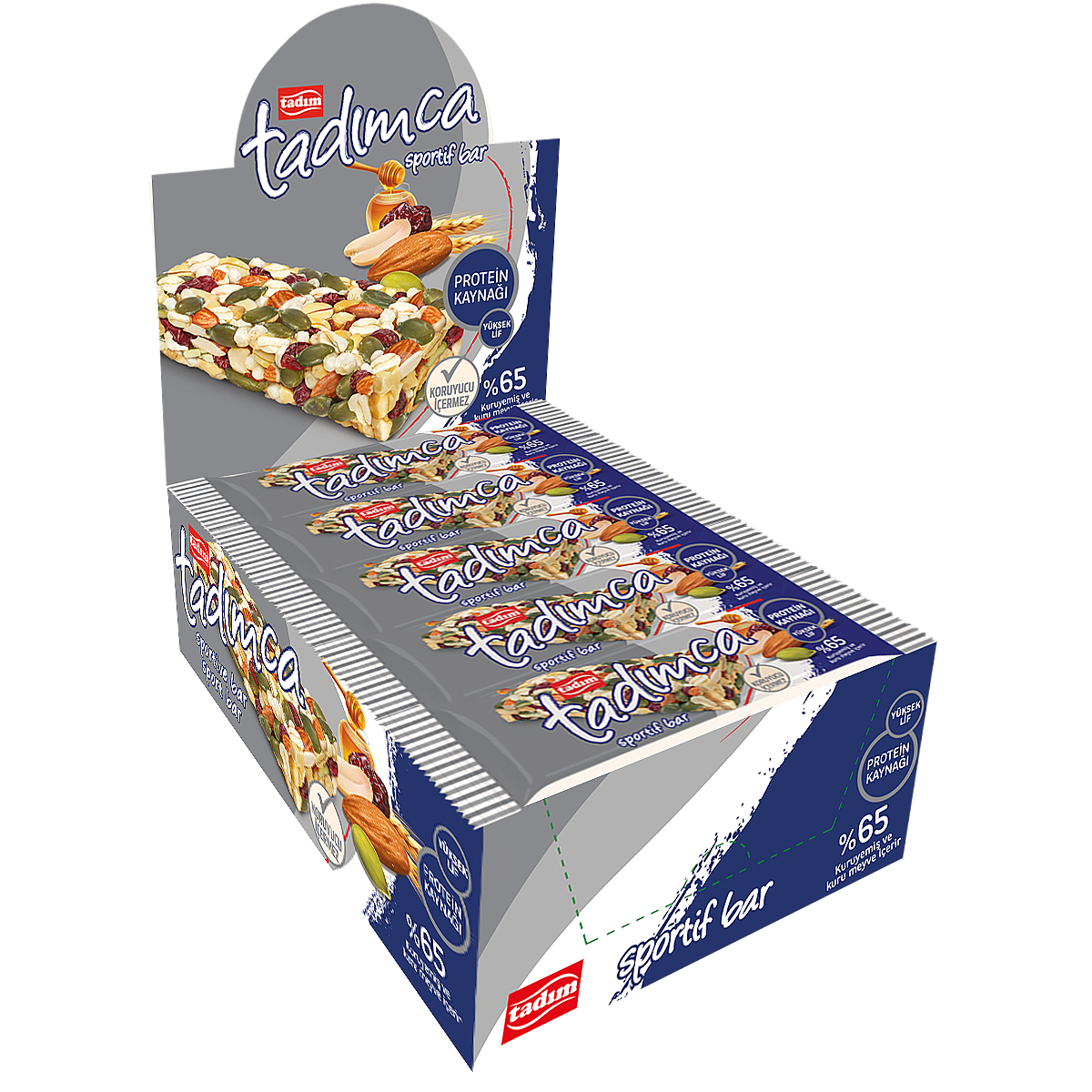 Günlük protein ihtiyacını karşılamak hiç bu kadar lezzetli olmamıştı! Sporu bir yaşam biçimi haline getirenlerin yeni favorisi, kuruyemiş barlar içinde hammaddeleriyle en çok ayrışan lezzet: Tadım Sportif Bar. Kuru meyvelerle, çiğ iç kabak çekirdeği, yer fıstığı ve cranberry’nin Tadım kalitesiyle bir araya geldiği Tadım Sportif Bar’dan sonra hayatın eskisi gibi olmayacak.